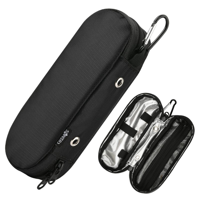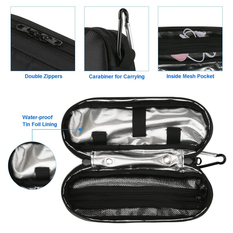 - Comes with a durable metal carabiner for easy carrying and travel. Double zipper design for quick access and closure.