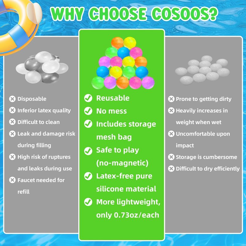 - 2025 New Year Gift, Lifetime Warranty, US Patent, Without Magnets, Silicone Water Balloons: Not magnetic and just made of 100 % soft high-quality, non-toxic silicone material, which make COSOOS reusable water balls much safer for kids to play. An eco-conscious alternative to traditional ones. Each refillable water ball only weighs 20.6 g/ 0.73 oz
