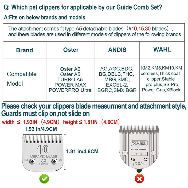 - 【CUSTOMER SUPPORTS】:If guide comb set that you purchase fails to fit your blades, please contact customer service and we will reply within 24 hours, we will arrange free of charge or refund