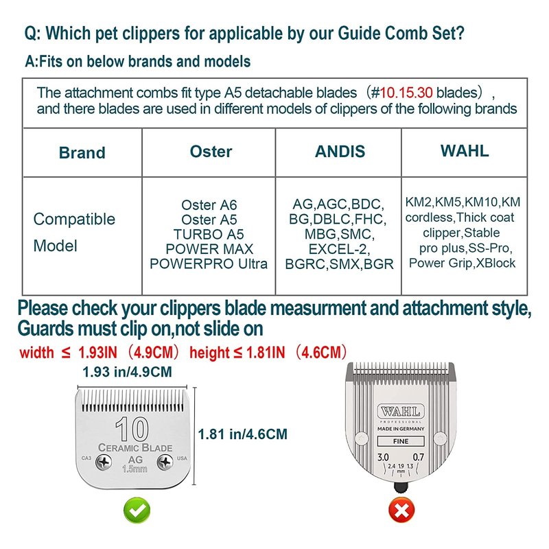 - 【CUSTOMER SUPPORTS】:If guide comb set that you purchase fails to fit your blades, please contact customer service and we will reply within 24 hours, we will arrange free of charge or refund