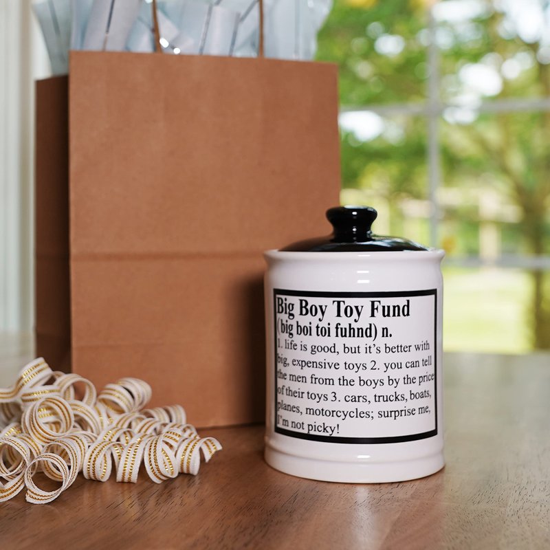 Guys, Dads, boyfriends and men everywhere will love this one of a kind Big Boy Toy Fund ceramic piggy bank for adults from Cottage Creek! This unique ceramic savings bank is hand dipped in lead-free glossy white glaze, twice kiln-fired, and is constructed using only outstanding ceramic stoneware materials. Our money box money jar has fade resistant designs on each side, are strong enough for everyday use and make fantastic coin banks and coin holders to hold loose change. One of a kind jars with lids are excellent cash jars to hold loose bills as well. Novelty office jars are 100% food safe making them ideal candy jars and jelly bean jars. These fun office decor jars will be perfect as a candy jar for office desks! Use this versatile jar around the home as a makeup jar, pen holder, rubber band holder, cotton ball and qtip holder, hair accessories organizer and more! Our fun piggy bank comes in a designed gift box, making this savings jar perfect gifts for men, gifts for dad, boyfriend gifts, guy gifts, Father's Day gifts, and more.