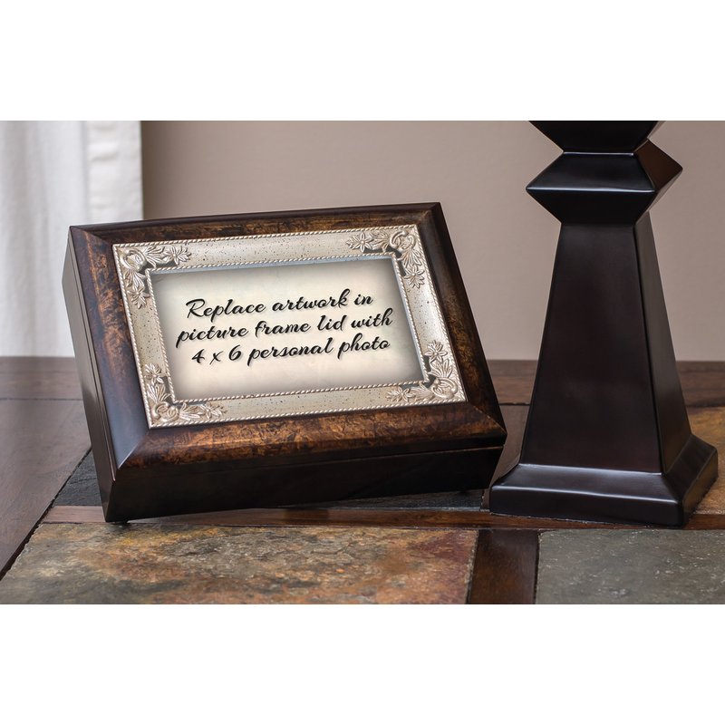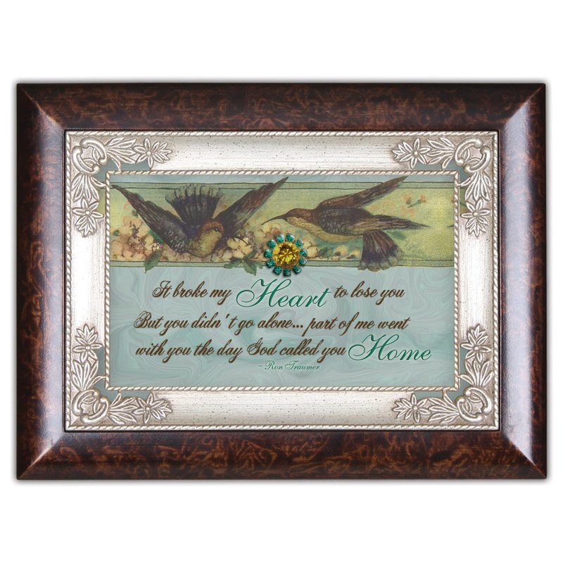 Cottage Garden inspirational and sentimental products are both lovely and classic in style. Be encouraged by a message that reads, "It broke my heart to lose you, but you didn't go alone . . . part of me went with you the day God called you home. " Designed by artists in the Heartland of America, Cottage Garden’s Collections reach a variety of tastes and have a wide range of occasions for gifting. Beautiful Italian inspired design with a rich burlwood finish and silver color inlay photo frame lid. Music box measures approximately 8 x 6 x 2.5 inches; Replace artwork with a 4 x 6 inch personal photo. Traditional wind-up mechanism engages music to play melodic tune Amazing Grace. Black velvet lined interior cushions your precious treasures; Decorative bun feet are padded to protect table top and shelf surfaces. Ships in protective packaging; Thoughtful gift for bereavement or memorial.