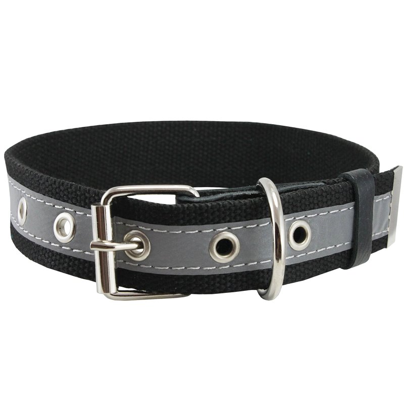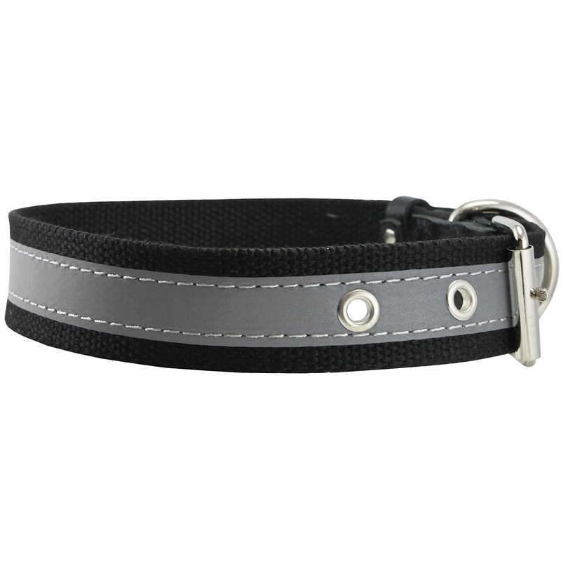 Very comfortable and pliable dog collar made of thick Cotton Web/Leather with stitched on reflective stripe - effective way to enhance visibility at night. Strong and durable, features metal enforced eyelets, nickel plated D-ring and buckle. Well made collar ideal for daily walks and training. Most suitable for medium breeds. Sized to fit 12"-16" neck, overall length is 18", 3/4" wide. Please measure dog's neck before you order.