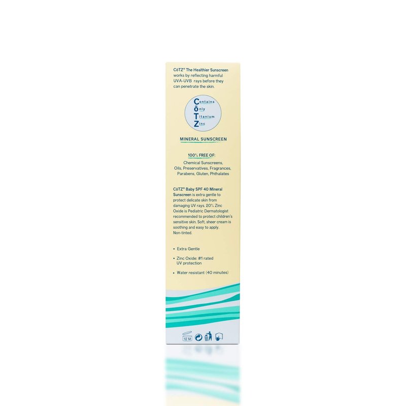 CōTZ BABY SPF 40 Mineral Sunscreen is extra gentle to protect delicate skin from damaging UV rays. 20% Zinc Oxide is Pediatric Dermatologist recommended to protect children’s sensitive skin. Soft, sheer cream is soothing and easy to apply. Non-tinted. This gentle mineral formula is perfect for baby’s sensitive skin. It is soft and sheer as it works to protect and soothe. Pediatric Dermatologist recommended for the most sensitive skin.