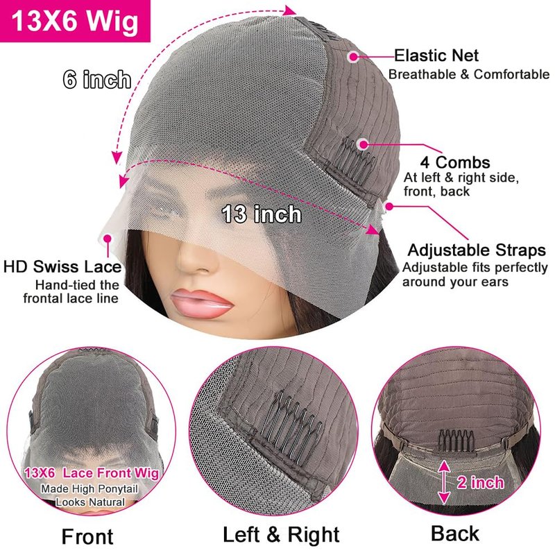 - Frontal Wigs Human Hair 13x6 Cap Size: Human Hair Wig Average Cap Size (21-22.5 Inch) with Adjustable Straps and 4 Combs, Ear to Ear 13X6 Transparent Swiss Lace, Easy to Adjust&Long-lasting, Can Tight Fit Most People's Heads Perfectly.