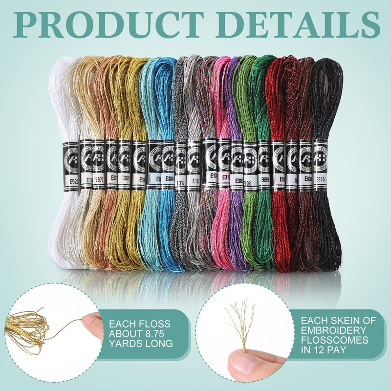 - Rich Quantity: the package boasts 57 skeins of metallic embroidery threads in 19 colors, with 3 bundles per color; Each thread contains 12 strands, This rich quantity allows for different decorative and craft production purposes; Users are thus afforded abundant resources to add luster to their projects; It's ideal for big projects or for keeping as a standby resource for those spontaneous crafting moments