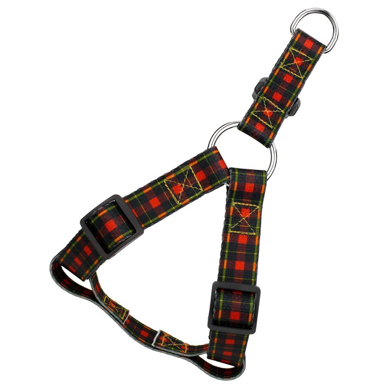 No matter what the current trend, buffalo plaid never fades out of style. Dating back to the 1800's when buffalo plaid was first woven, it has been a popular design and a representative of ''heritage tradition''. This Country Brook Petz Buffalo Plaid Step-In Dog Harness embraces this essence of the past. The stripes are consistently intertwined in shades of black and red, but also feature a splash of yellow. Unlike collars, harnesses are designed to take the pressure off of your dog's neck and place it onto their chest. If your puppy is an escape artist with collars, our harness will be able to restrain them easily. The Country Brook Petz Buffalo Plaid Step-In Dog Harness will keep your pet secure and keep you in control! The Step-In style Harness is easy to put on and take off. Simply lay the harness flat on the ground and place your dog's front paws in each opening and then buckle the harness together around their back. The step-in design and plastic adjustable slides will ensure a great fit for your pet.