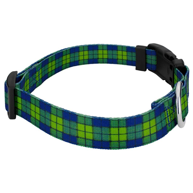 Country Brook Petz' Deluxe Dog Collar & Leash is a fun take on the traditional plaid you already love. These bold and lively colors create a composition that is both classic and refreshing. Sharp lines with contrasting colors embody the standard design of plaid. Printed using our colorfast dye, there are no runs or bleeding onto your pupper. Made from superior hardware and webbing, Country Brook Petz' Blue and Green Plaid Deluxe Dog Collar & Leash will provide you with a sense of ease when using our products. This Blue and Green Plaid collar and leash set are uniquely designed and have a silky smooth polyester loop that slips over your hand, giving you a comfortable grip while walking your pet. Box stitching ensures strength for when your pup pulls against their leash. These collars and leashes are washable, with mild detergent, and dry when laid out. The Extra Small, Mini and Micro are still reliable with a 700 lb. tensile strength, even though they may seem delicate. We know that you want the best for your pets, that's why we make all of our products here in the United States. Equipped with wide-mouthed, heavy-duty triglides for easy adjustment, and heavy-welded d-rings for your dog's security. Leashes are constructed with high grade snap hooks and polyester that ensures your puppy won't break the leash. Walk your pup with confidence knowing that Country Brook Petz has you in mind when creating our products. Style isn't all we have going for our collars and leashes!