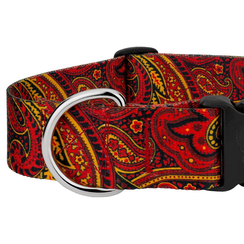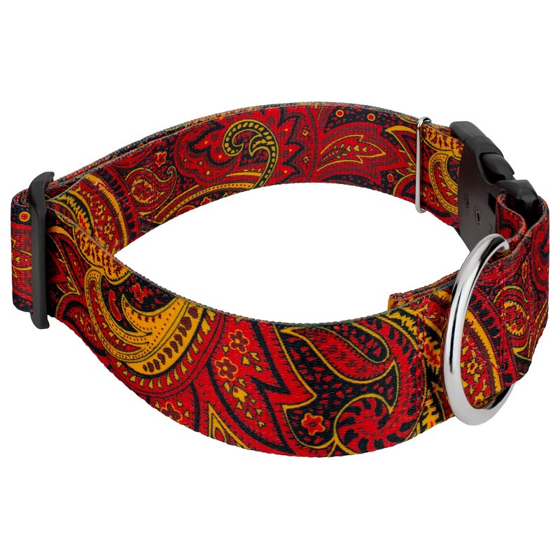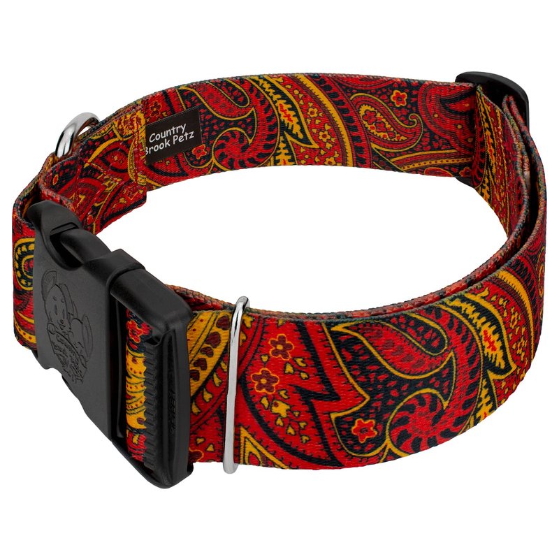 Country Brook Petz' Fire Paisley 1 1/2 Inch Deluxe Dog Collar is here to bring you the traditional print of paisley with vivid colors that make everything pop. This ornamental, Persian inspired design features a smooth floral-like pattern, flowing lines, and complementary colors that will contrast against your applications; this classic composition will be a hot item for all-year-round use. At the heart of this exceptional collar lies our premium polyester webbing, a high-strength and resilient material known for its remarkable durability. Whether your dog is a spirited explorer or a playful companion, this collar can withstand the test of time and keep up with their boundless energy. The sleek and smooth texture of the polyester webbing ensures a gentle touch against your dog's neck, eliminating any discomfort or irritation. Your loyal companion will revel in the luxurious comfort that this collar provides, allowing them to strut their stuff with unmatched confidence. To further elevate the collar's functionality, we constructed it with YKK brand buckles, renowned for their exceptional quality and reliability. These buckles are not only stylish but also incredibly secure, giving you peace of mind knowing that your furry friend is always safe and sound. The YKK brand buckles are engineered with precision, featuring a seamless interlocking mechanism that guarantees a secure fit. They are easy to use and offer a hassle-free experience, allowing you to fasten and release the collar with a simple snap effortlessly. Whether you're preparing for a leisurely stroll or an exciting outdoor adventure, this collar ensures quick and convenient handling. Besides its undeniable elegance, our Deluxe Dog Collar is also equipped with a sturdy welded D-ring for easy leash attachment. This feature guarantees a seamless transition from playtime to outdoor walks, allowing you to maintain control without compromising on style or comfort.