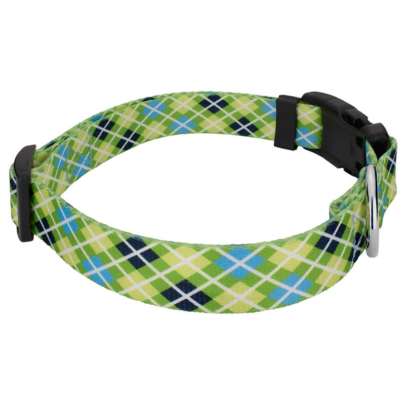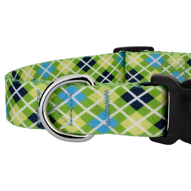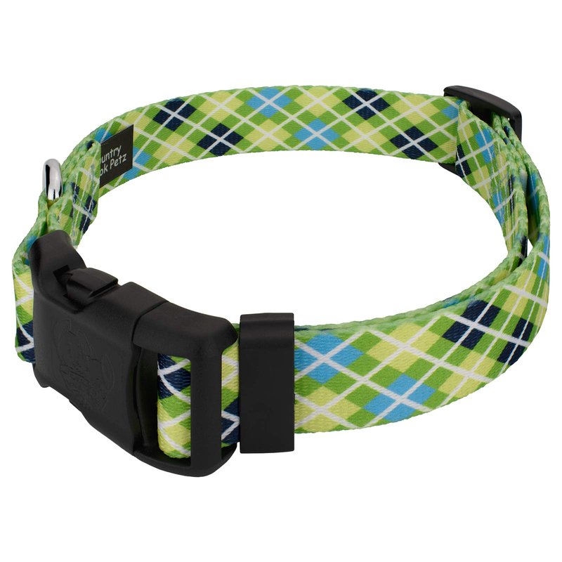 It's 5 o'clock at Country Brook Petz and we have just the design for your argyle, toes in the sand needs. This classic design features vibrant blue and black diamonds contrasting against rich shades of Margarita green; white diamond outlines bring the pattern together. These deluxe patterned collars are a safe, comfortable, collar made right here in the U.S.A. We like to give you the assurance that our dog collars are made to last so we construct with YKK contoured side release buckles, strong polyester webbing, heavy-duty wide-mouth triglides, and heavy welded D-rings. Our polyester collars are ribbed, soft, and sleek to the touch with a little bit of a sheen; we make sure that your pet shines like the star they are. We know that you have your pet’s comfort and safety as a top priority, so do we. The Extra Small, Mini and Micro are still reliable with a 700 lb. tensile strength, even though they may seem delicate. We want your furbaby to be able to show the world their new collar immediately, so be sure to measure for the right size. You can check this out by using a string, or tape measure, to see where the collar will fit snugly and comfortably on your dog’s neck. These stylish prints work well with both boy and girl puppers.
