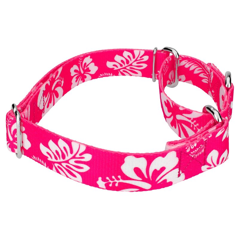 Light up the tikis and put on your grass skirt because we have the perfect tropical getaway for you! Experience the tranquility of the tropics with Martingale Pink Hawaiian Dog Collar & Leash. When you order this dog collar and leash set, you will receive a martingale collar and a matching leash; collar size of your choice with an accompanying 6 foot leash. These Pink Hawaiian collar and leash sets are uniquely designed and have a silky smooth polyester loop that slips over your hand, giving you a comfortable grip while walking your pet; box stitching ensures strength for when your pup pulls against their leash. The Extra Small, Mini and Micro are still reliable with a 700 lb. tensile strength, even though they may seem delicate. Our martingale collars are designed to prevent your pup from pulling out of their collar by tightening around your dog's neck whenever they try to remove their heads. Perfect for training, the twin loop design gives you control over your stroll. By adjusting the metal slide, you give slack to the loop. Slip it over your dog's neck and decrease size until you can comfortably slip only a couple of fingers under the collar. The unique limited closure prevents the choke from becoming too tight. We at Country Brook Petz pride ourselves on only using the best hardware and you can rest assured that these collars will withstand whatever your pup brings its way. Our collars have wide-mouthed heavy-duty triglides for easy adjustment and heavy-welded D-rings for strength. Designed to give you back control while your pup is leashed.