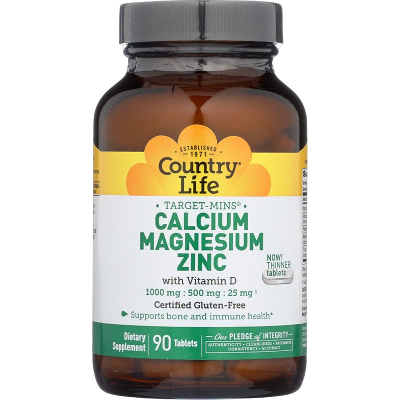 Country Life Target Mins Calcium-Magnesium Zinc with Vitamin D, 1000mg/500mg/25mg 90 Count, Certified Gluten Free, Certified Vegan