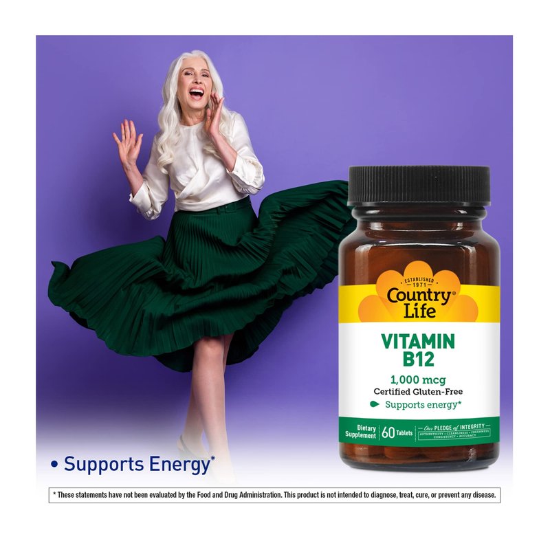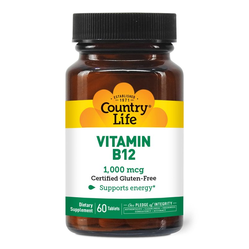 Country Life Vitamin B12, Supports Energy & Red Blood Cell Production, 1000mcg, 60 Tablets, Certified Gluten Free, Certified Vegan, Certified Halal