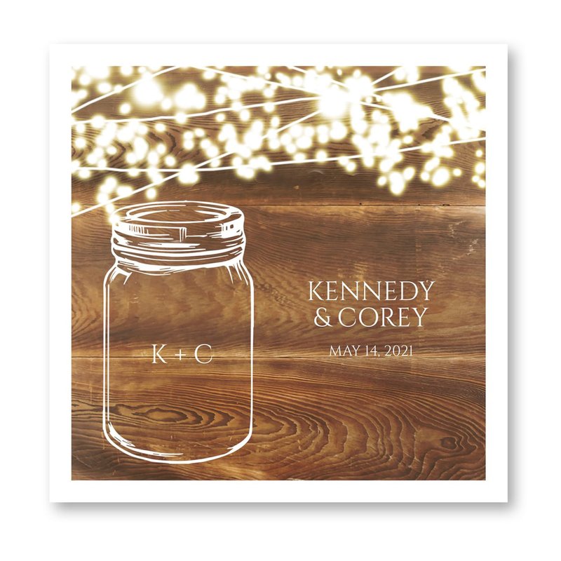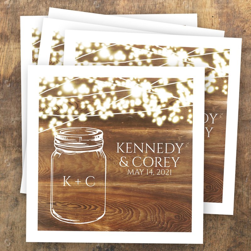 - This rustic wood with bright country string lights and jar design creates the perfect complementary napkin for a wedding, reception, anniversary, baby shower, special event, or party.