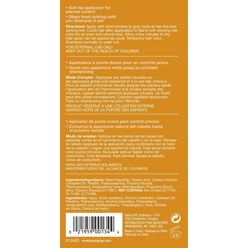 Get to the root of the problem with Cover Your Grays Root Touch-Up. This Sponge Tip applictor is the go-to solution for covering up your roots between colorings. Available in 6 color shades, the Root Touch-Up is ideal for broad areas of hair, roots and sideburns. Excellent for travel, fits perfectly in purses, clutches and pocket books. Sponge Tip applicator Ideal for broad areas of gray hair, sideburns and roots Compatible with all hair color No water needed, just open applicator and apply Will not mat or clump Lasts all day Easily washes out with shampoo
