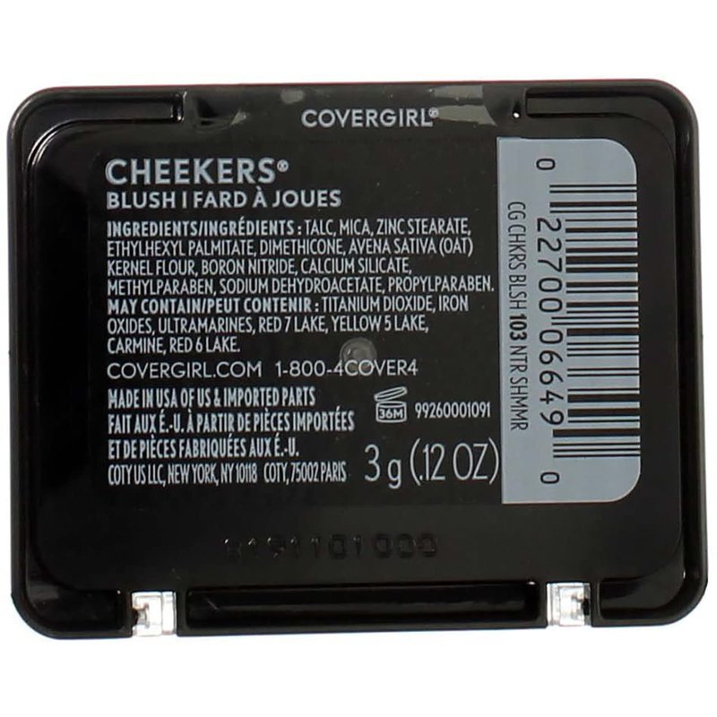 CoverGirl Cheekers Blush 103 Natural Shimmer. For an easy and natural look, CoverGirl Face Cheekers Blush is the best for on the go busy women. This portable mini compact can be placed anywhere and even in a purse for its portability. Stays natural for hours. Easy & natural. Lightweight. Dermatologist tested. 0.12 oz.