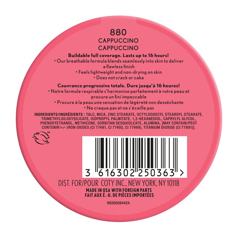 New! Full coverage. Up to 16 hours. Cappuccino. Buildable full coverage. Lasts up to 16 hours. Our breathable formula blends seamlessly into skin to deliver a flawless finish. Feels lightweight and non-drying on skin. Does not crack or cake. Cruelty-free. Made in USA with foreign parts.