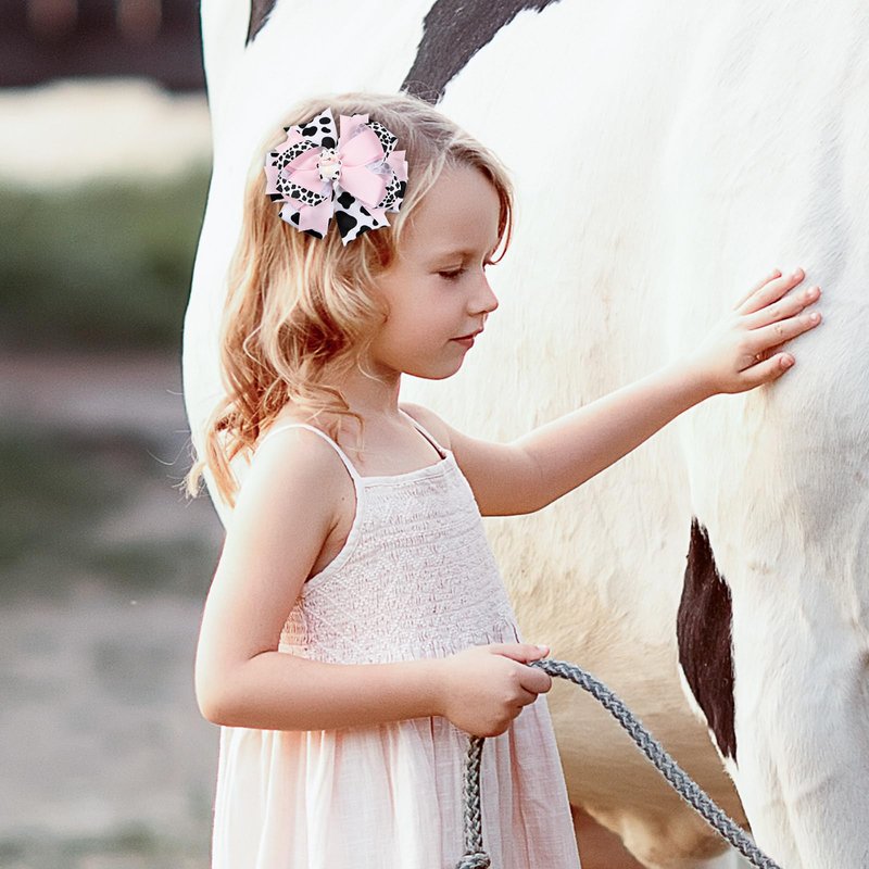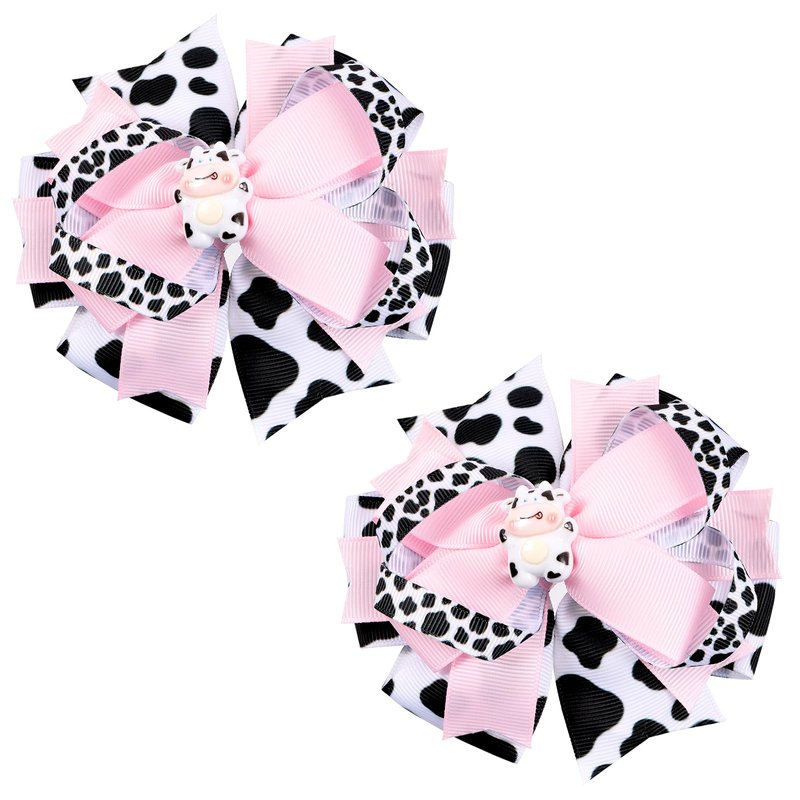 - Boutique Pink Cow Print Hair Bow Clips- 2pcs hand-made cute black & white pink cow print hair bow clips,lovely happy-cow centered with study alligator clips,well made with quality cow print grosgrain ribbon,perfect for her side bun,top of ponytail, piggy tails. Comfortable and durable to keep hair from slipping off.
