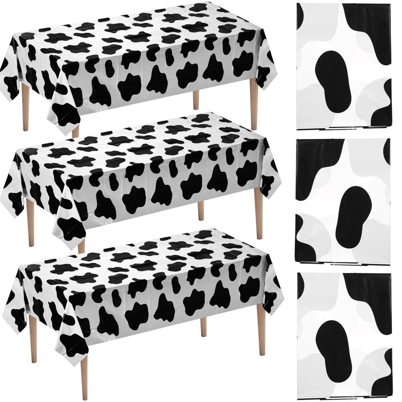 - SET OF 3 - COW PRINT TABLECLOTHS: Premium Black and White Cow Print Tablecloths made of High-Quality Plastic Material that does not rip or tear easily. Each order includes a Pack of 3, Rectangular Table Covers that Fit Most Average-Sized Tables.
