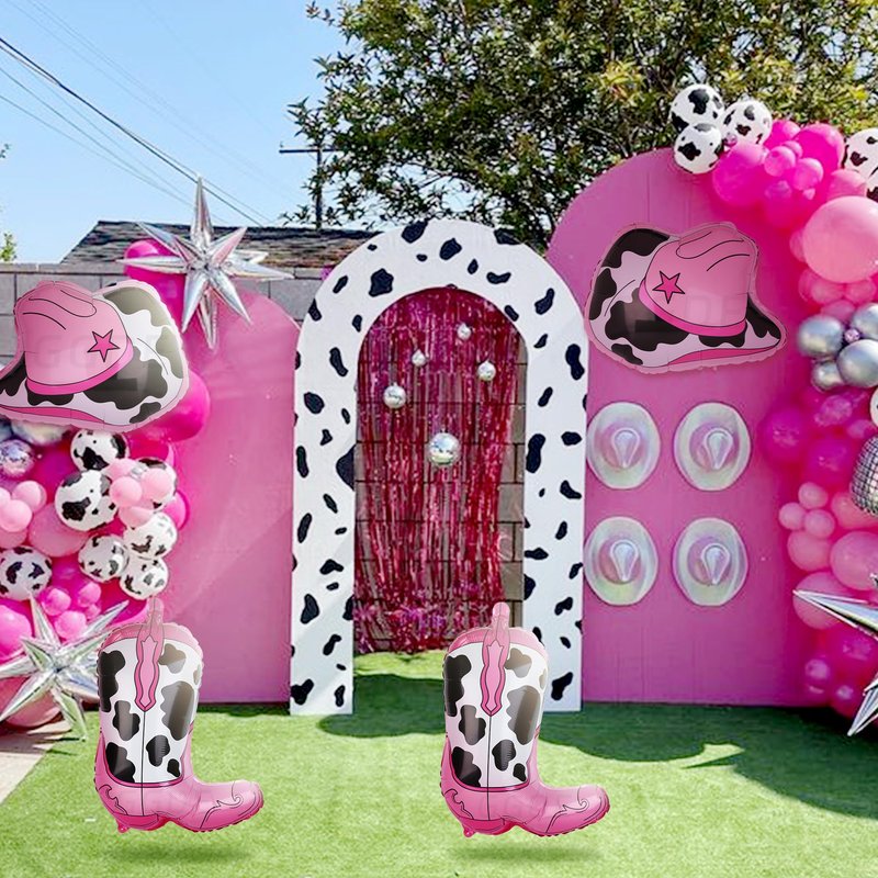- Western Party Decor: these cowgirl boot balloons are the perfect decoration to make a statement. Their pink color and cow print design add a fun and stylish touch to any party theme. Whether you're celebrating a birthday, hosting a baby shower, or throwing a western-themed gathering,these cowgirl boot balloons will transport your guests to the wild west and create a party atmosphere that will have everyone saying, "Yeehaw!"