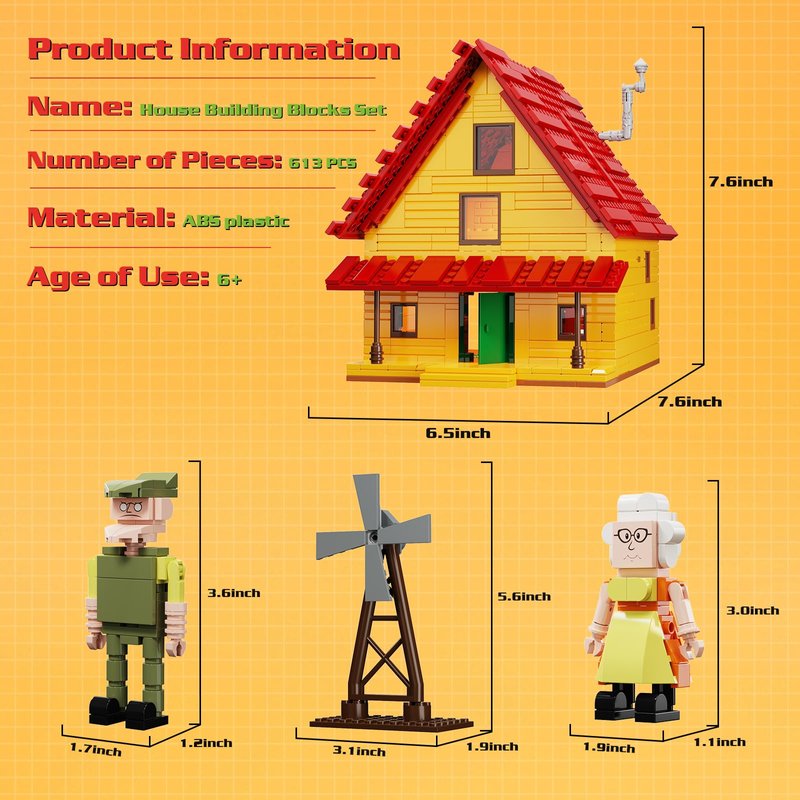This house building set is from the movie, the package contains 613 building blocks, the finished size is 6.5 x 7.6 x 7.6 inches, perfectly restores the scene of the house in the movie, it is a perfect decoration for desks and Christmas