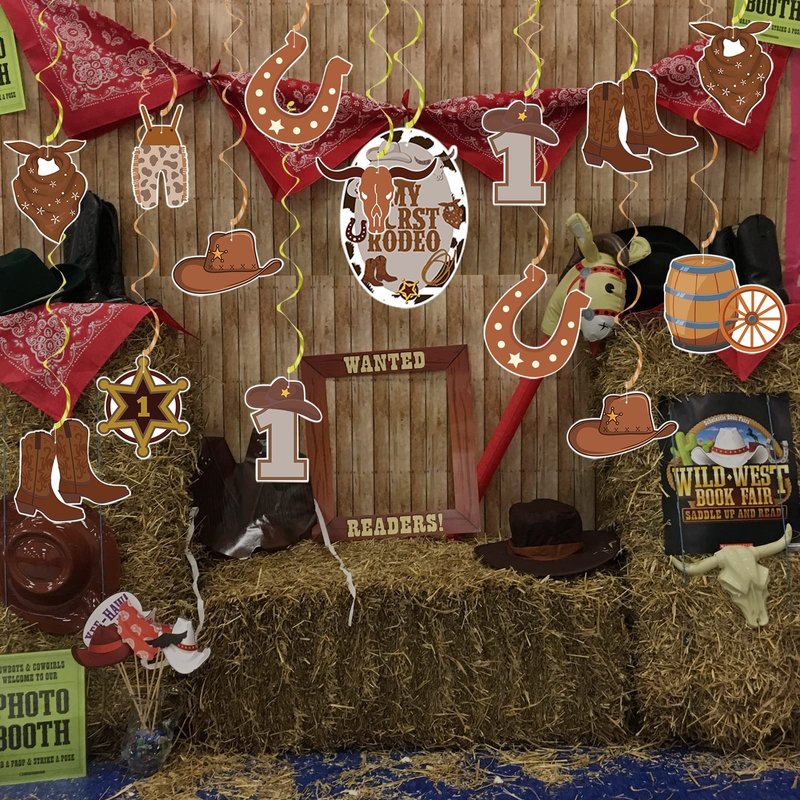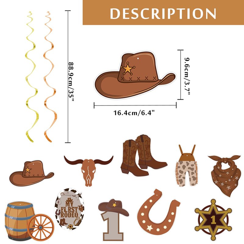 - COMPLETE WESTERN PARTY SUPPLIES KIT: Get everything you need for a Western cowboy themed party with 40-piece decoration set, including foil swirl decorations, barrel(wheel), boots, scarf, "my first rodeo birthday party" badge, Cowboy hat, Bullhead, "Cowboy one year old" badge, and more. Plus, our cowboy stickers are easy to carry, so you can enjoy your Western party anytime, anywhere.