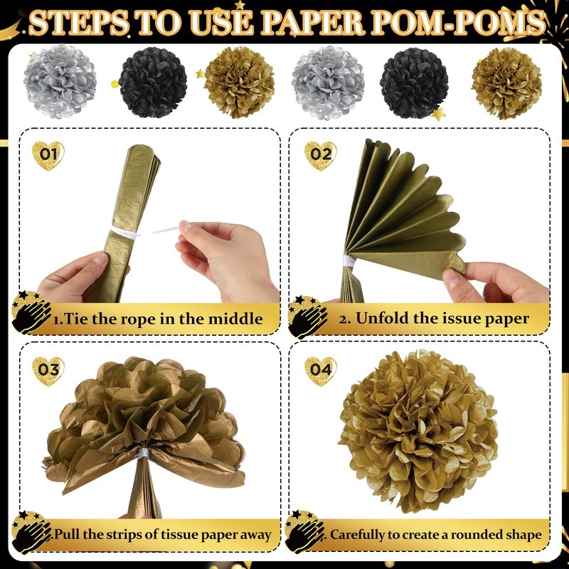 6 PCS Black Gold Farewell Tissue Paper Pom Poms
