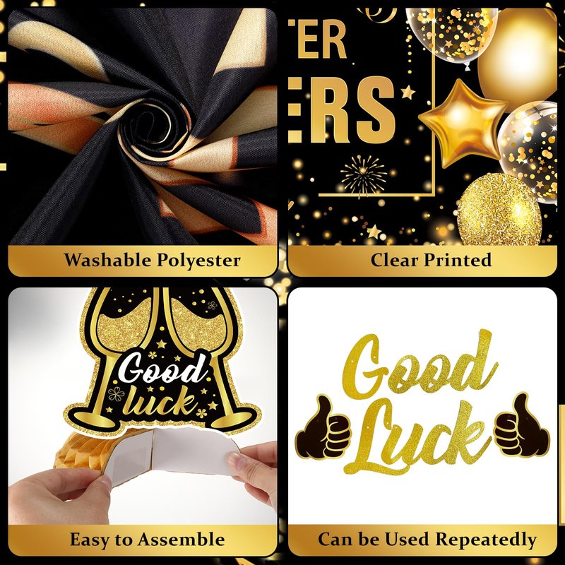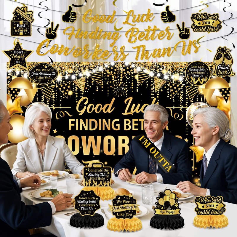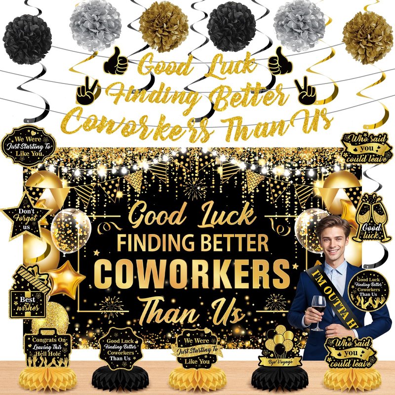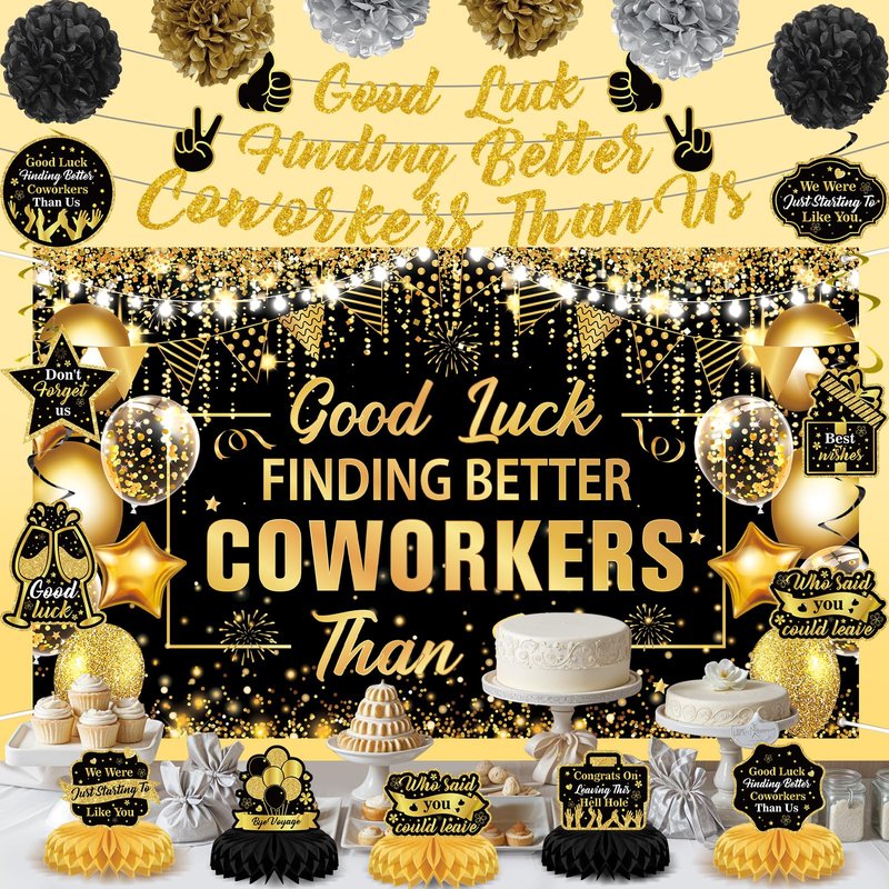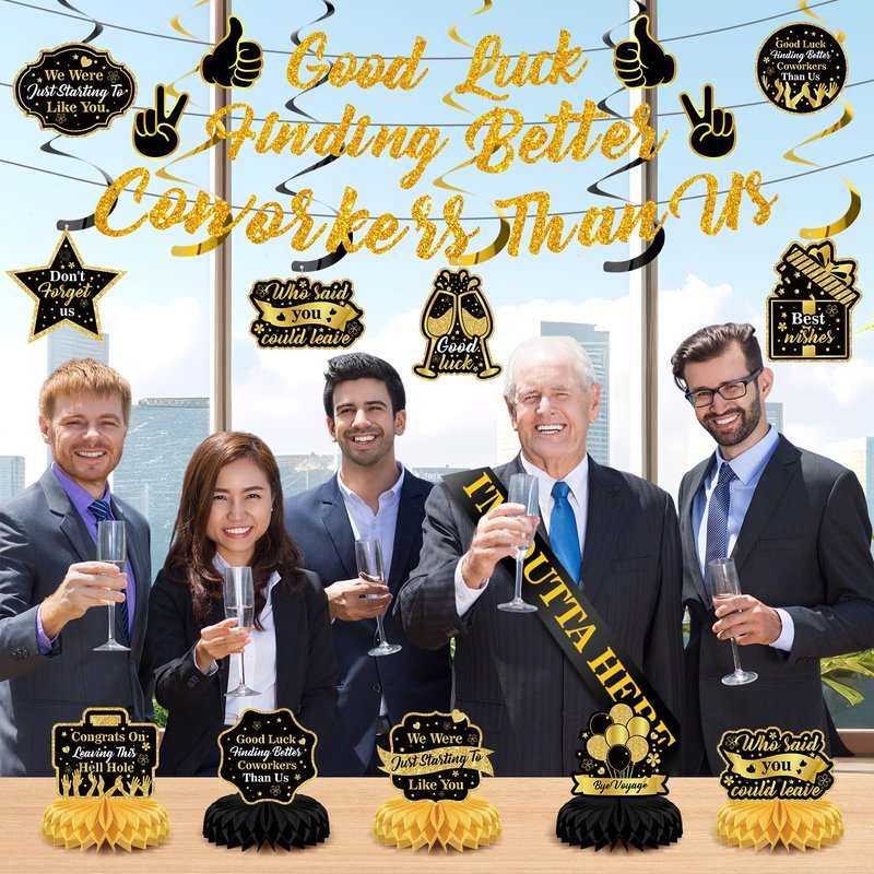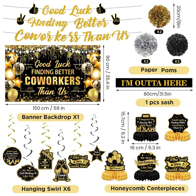 - Package Include: Our coworker leaving decorations includes a good luck finding better coworkers than us banner backdrop, 1 piece good luck finding better coworkers than us banner, 5 piece black gold going away honeycomb centerpieces , 6 piece goodbye hanging swirls, 6 piece black gold tissue paper pom poms, 1 piece I’m outta here sash