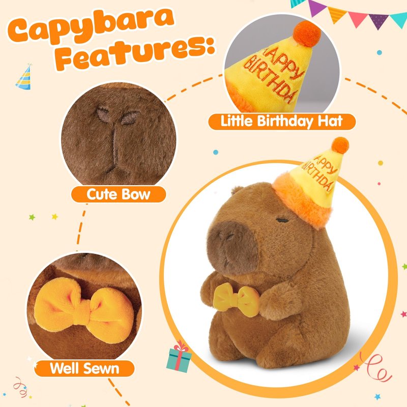 - Cute Capybara Design: Our cute capybara plush featuring a festive birthday hat and an orange bowtie, which is deeply loved by people. Unique and funny design, making it a perfect gift for capybara lovers.