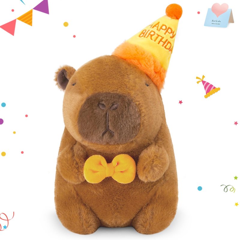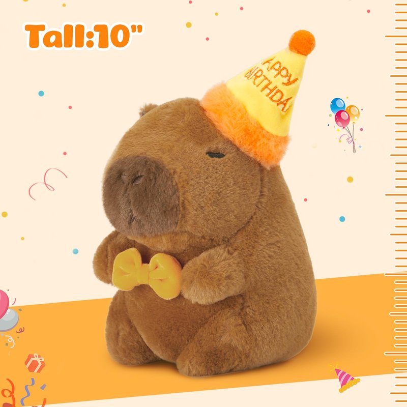 This 10-inch soft and huggable capybaras happy birthday plush wears a festive birthday hat and a cute orange bowtie, making it the perfect gift for kids and adults alike.