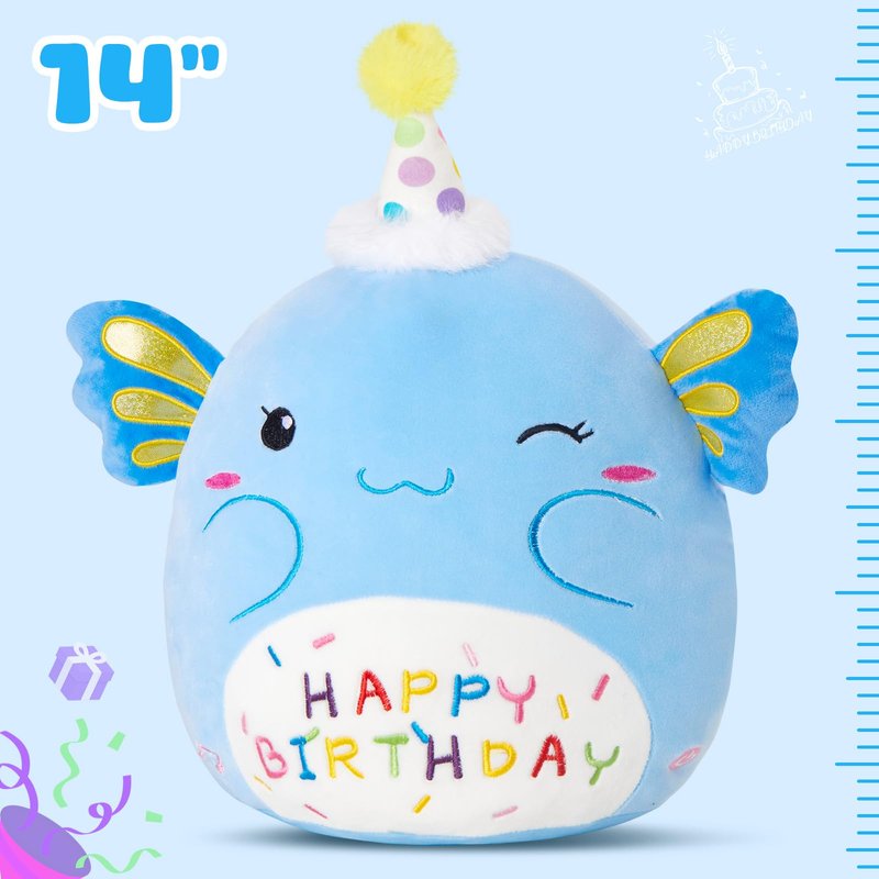 - Super Soft Comfort: 16 in*11 in*9 in (includes the height of the birthday hat). Our blue axolotl plushie is elaborately made of spandex super soft fabric and filled with PP cotton, which is soft and comfortable.