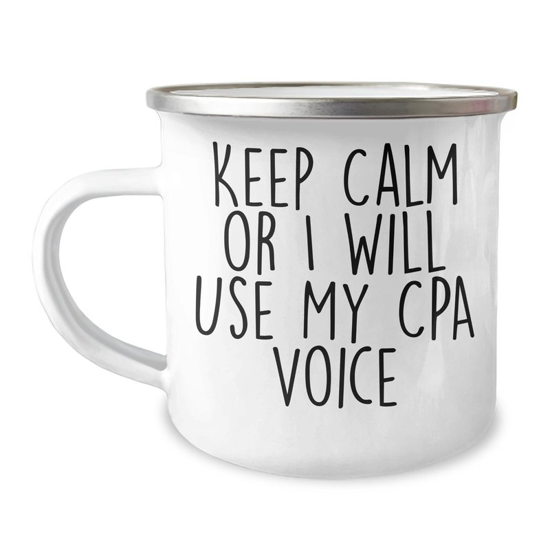 - Make a statement with our unique Camping Mug, designed to make a statement. The quote 'Keep Calm or I Will Use My Cpa Voice' is a bold statement that shows you're proud to be a CPA, and this mug is the perfect way to express that. Whether you're a graduate or just a fan of camping, this mug is a great way to show off your love for the outdoors.