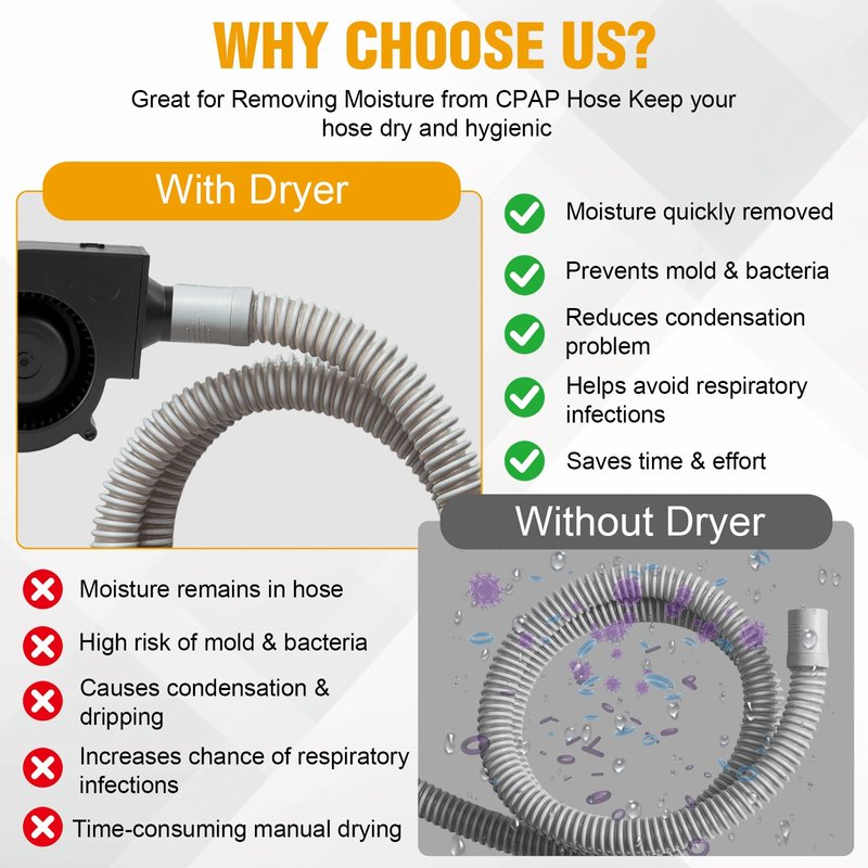 - 【Ambient Airflow for Hose Protection】Blows ambient temperature air to prevent heat damage and extend the life of your CPAP hose. Includes 1 CPAP hose dryer and 1 US power adapter for immediate use.