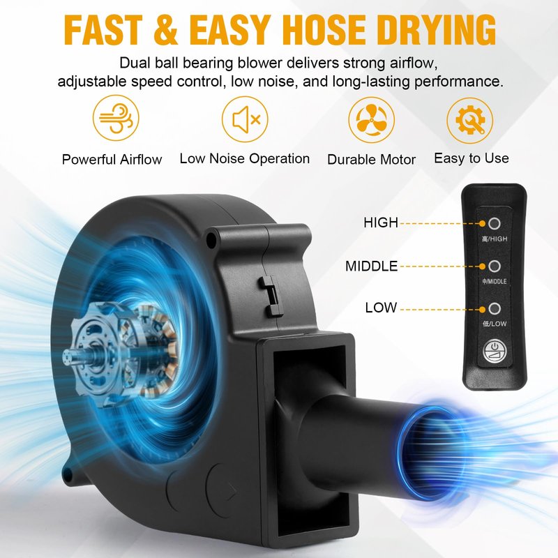 - 【Fast & Efficient Drying】Features a powerful dual ball bearing blower that delivers strong yet quiet airflow. Dries most hoses in just 45–60 minutes — no more waiting hours for moisture to evaporate.