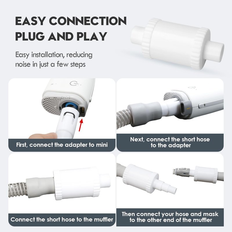 - EASY CONNECTION: Easy to use, it was plug and play with your hose. Muffler and connection adapters are a good solution to adapt the flexibility of old cpap masks and hoses to the new Air Mini device