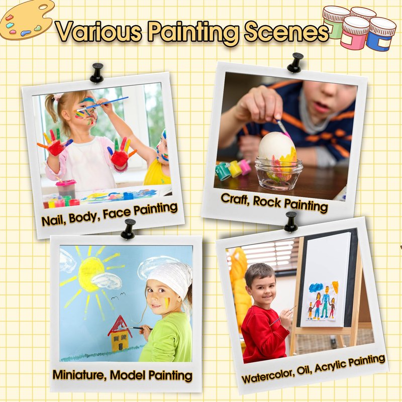 - Wide Application: These acrylic paint set are suitable for most material surfaces, including paper, stone, fabric, walls, plastic, wood board, ceramics, etc. Very suitable gift for creative adults, beginners, kids, teens