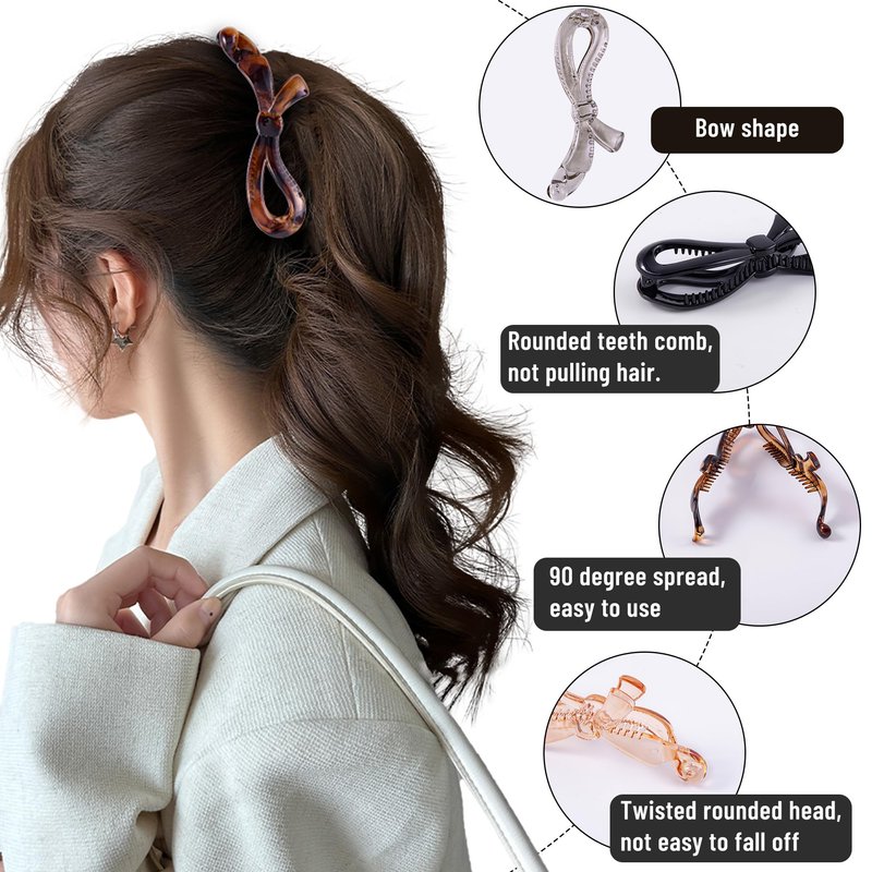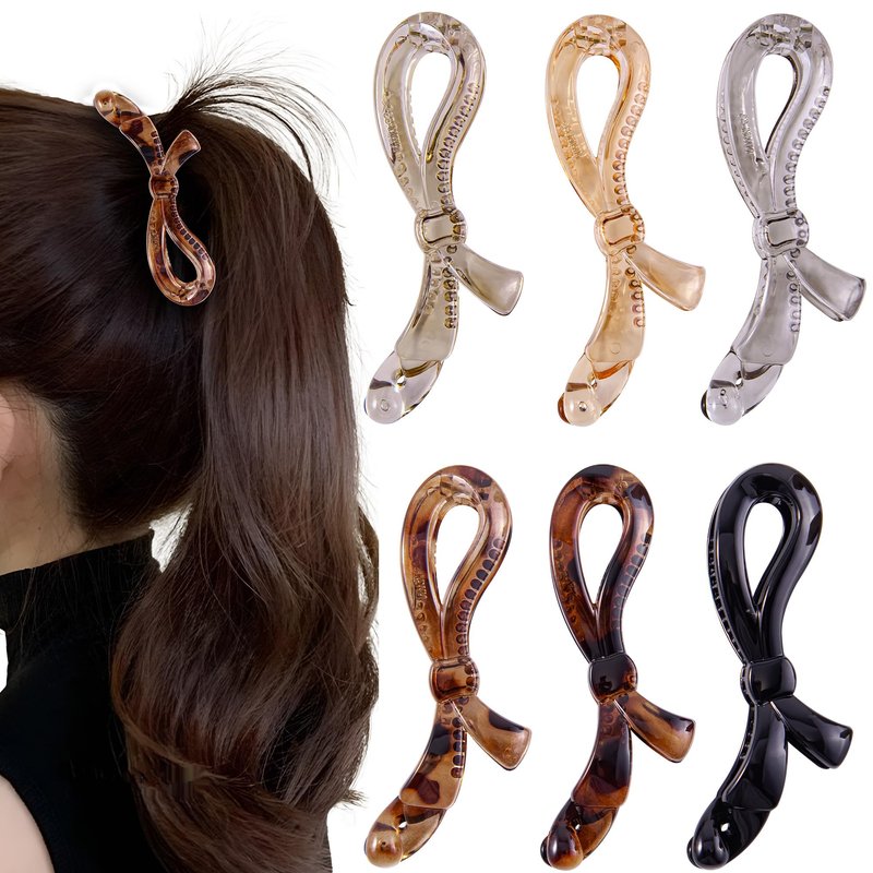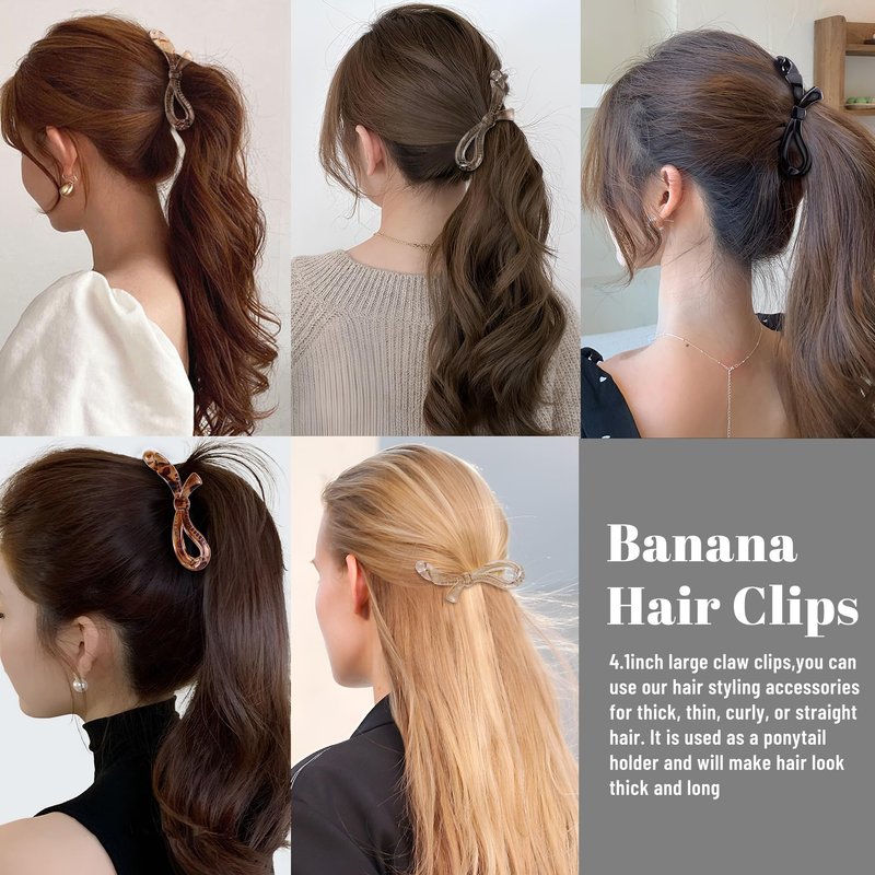 Color:Black tortoiseshell amber tawny champagnet gray Quantity: 6 PCS,1color with 1pcs Materials:Premium plastic Shape:Bow banana clips Hairstyle:Thick,thin,long,curly,straigh,ponytail holde,hair bun Occasion:Work,study,party,sports,bathing,makeup,festivals and so on