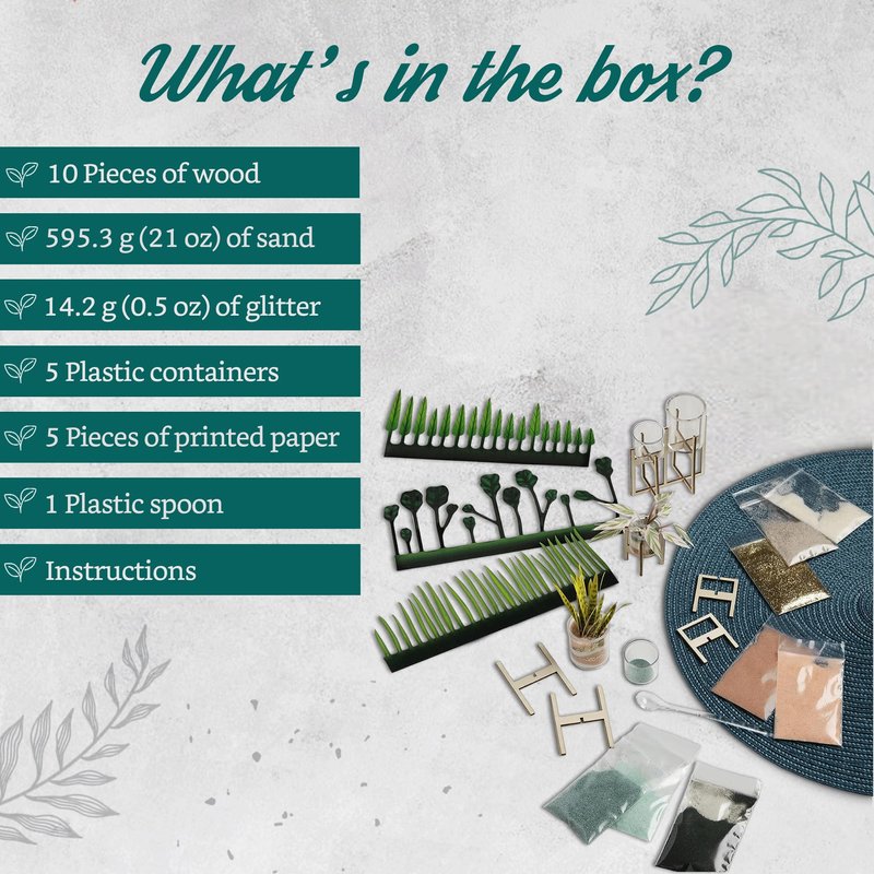 - Abundant crafting materials: Each faux plant kit includes 10 pieces of wood, providing a sturdy canvas for your sand art designs. With a generous supply of 595.3 g (21 oz) of sand, 14.2 g (0.5 oz) of glitter, 5 plastic containers, 5 pieces of printed paper, and a plastic spoon.
