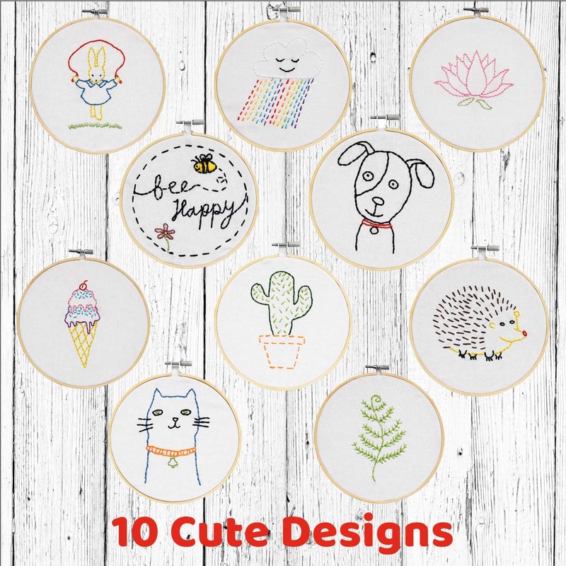 - ★ ALL THE SUPPLIES YOU NEED TO COMPLETE 10 CUTE EMBROIDERY DESIGNS - 10 iron-on transfer designs, 2 embroidery hoops, fabric, 12 colors of embroidery floss, needles, bonus tote bag, 23 pages of detailed, easy-to-follow instructions.