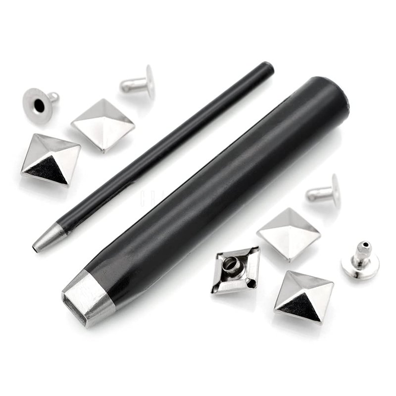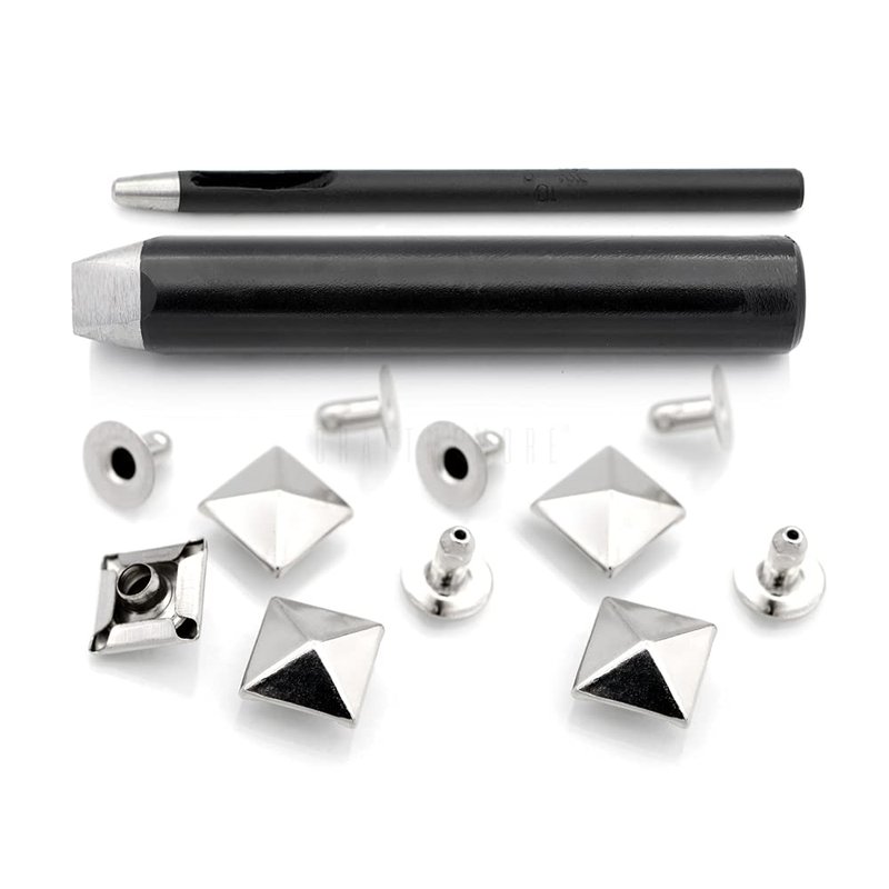 - Fixing tool for pyramid rivet. The set includes Rivet Setter (driver) + Hole Cutter + 20 Silver pyramid rivets.