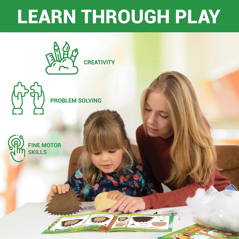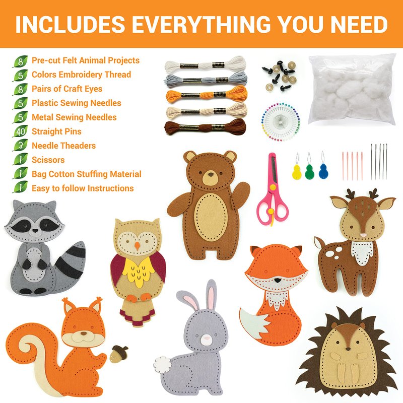 - π¨ CONTAINS EVERYTHING YOU NEED: This sewing kit contains everything you need (yes, really everything) so you can get started straight away on these fun craft projects. This 165+ pcs set includes 8 pre-cut felt animals projects, 5 colors of embroidery thread, 10 pairs of craft eyes, plastic and metal sewing needles, 40 straight pins, needle threaders, scissors, stuffing, and easy to follow instructions.