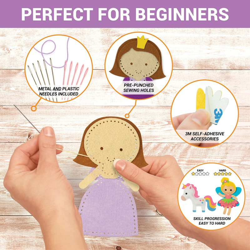 - π PERFECT FOR BEGINNERS: Because the holes are pre-punched, kids have a clear guide to help make neat and even stitches. If you feel your kids are not quite ready for metal needles we have also included plastic needles so they can practice safely. While other kits come with a glue bottle to attach the smaller parts, which can leak and often doesn't stick well, our kit comes with premium 3M sticker backings. Just peel off the protective layer, and stick it securely in place.