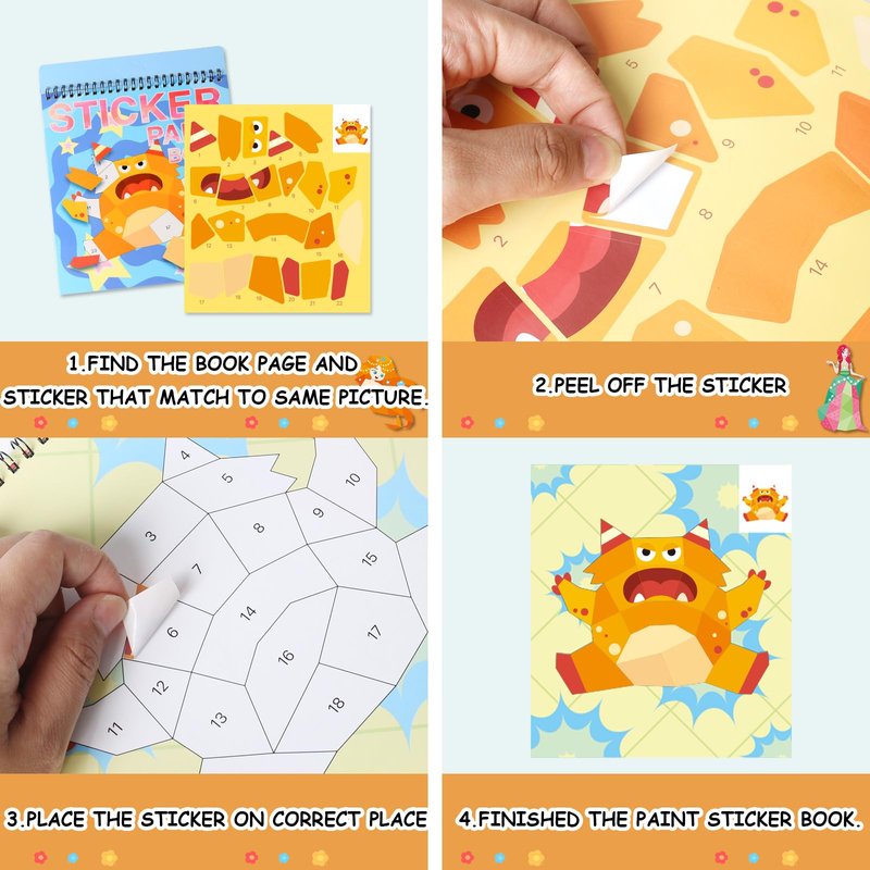 Why choose Sticker by Number Book for Kids from the TPQKA Store? 1. 4 Pack cute stickers Theme include Monster-Desserts-Vehicles-Ocean Number Sticker books for kids girls boys ages 3 4 5 6 7 8. All of which are colorful designed, high quality.