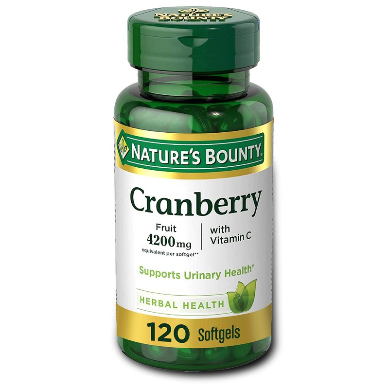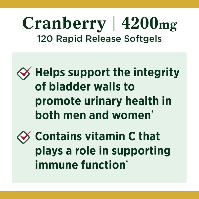 - PROMOTES URINARY HEALTH: 120-count, 4200mg, twin-pack Cranberry with Vitamin C Softgels. Nature’s Bounty Cranberry with Vitamin C Softgels support the walls of the bladder in both men and women