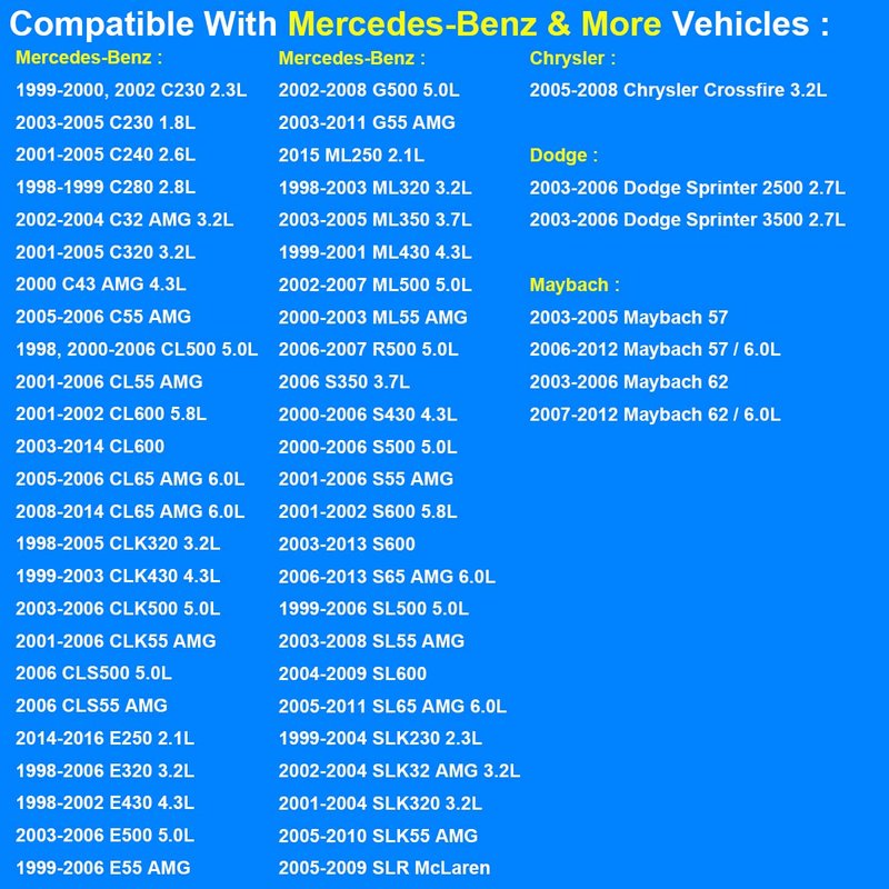 - COMPATIBLE WITH MERCEDES-BENZ VEHICLES : 2001-2005 C240 | 2005-2006 C55 AMG | 1998-2005 CLK320 | 2003-2006 CLK500 | 1998-2006 E320 | 2003-2006 E500 | 1999-2006 E55 AMG | 1998-2003 ML320 | 2003-2005 ML350 | 2002-2007 ML500 | 2000-2006 S430 | 1999-2006 SL500 & more. Please check the description for all vehicles.