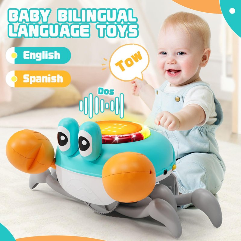 - CRAWLING CRAB BABY TOY: Switch on the crawling crab baby toy, is vivid and noisy run away, encouraging babies to crawl; The display shows where the crawling crab is moving, right or left, subtly teaching direction to babies; With obstacle avoidance features on both sides, the baby crawling crab always keeps little ones crawling in a safe area