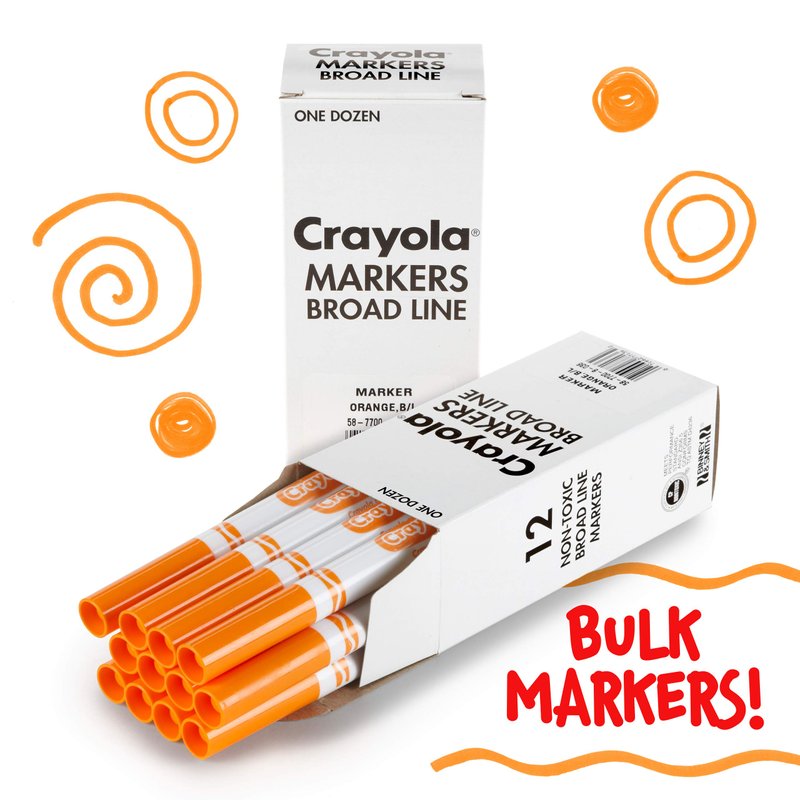 - CRAYOLA BULK MARKERS: Features 12 Orange Broad Line Crayola Markers in a reusable tuck box.