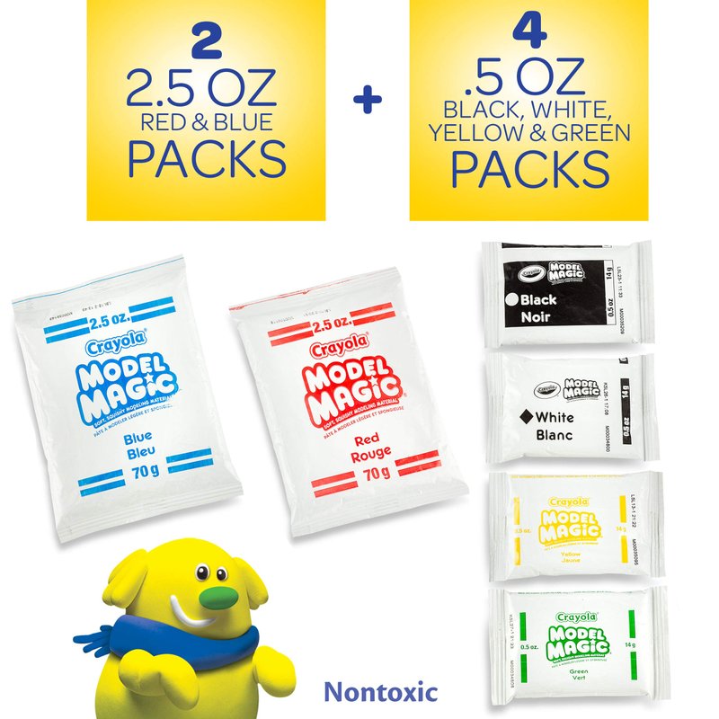 - MODEL MAGIC: This lightweight, spongy modeling material sticks to itself—not your hands. Model Magic 6 Color Craft Pack comes with one 2.5 ounce pack each: Red & Blue and one 0.5 ounce pack each: Yellow, Black, White & Green.