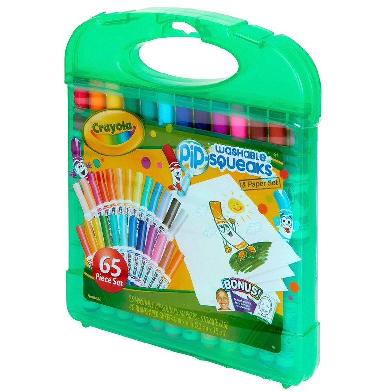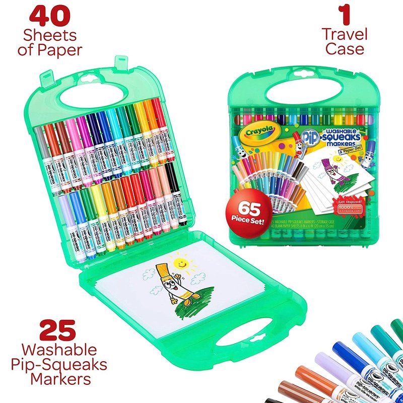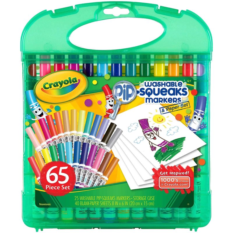 - 65 PIECE PIPSQUEAKS MARKER SET: This set includes 25 Pip-Squeaks Washable Markers and 40 sheets of paper in a durable art case for kids.