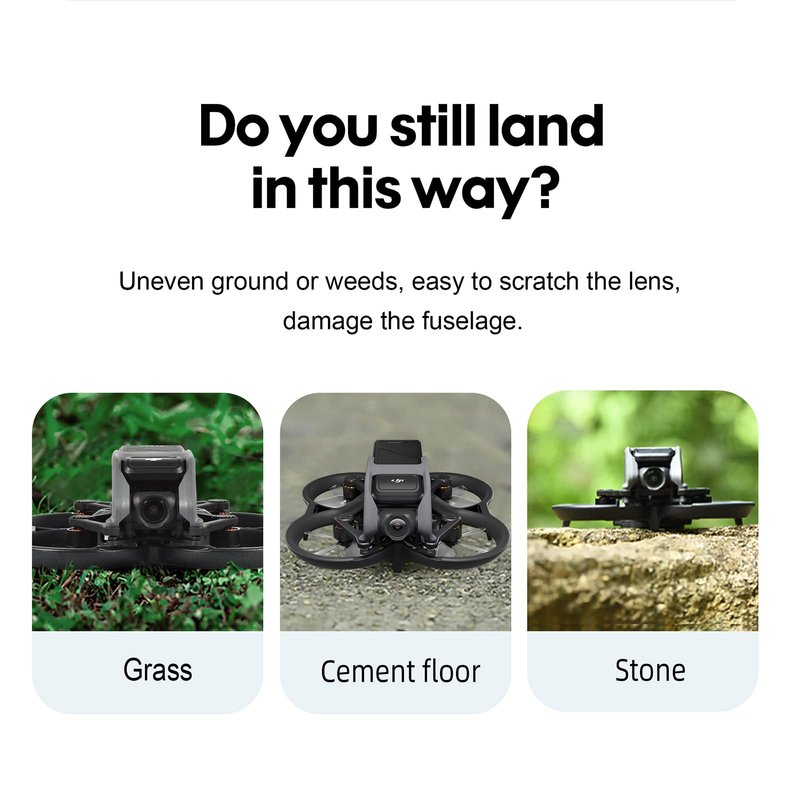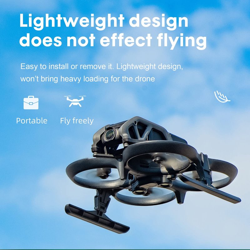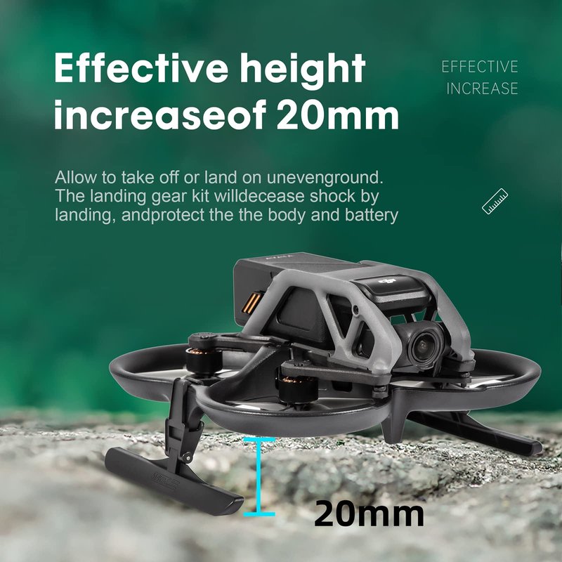 - 【Compatibility】The Lightweight landing gear is designed for the DJI Avata drone. Effectively increase the height of 2.0cm(0.79 in), and avoid ground debris or water stains from soiling or damaging the drone body, gimbal, and propellers.